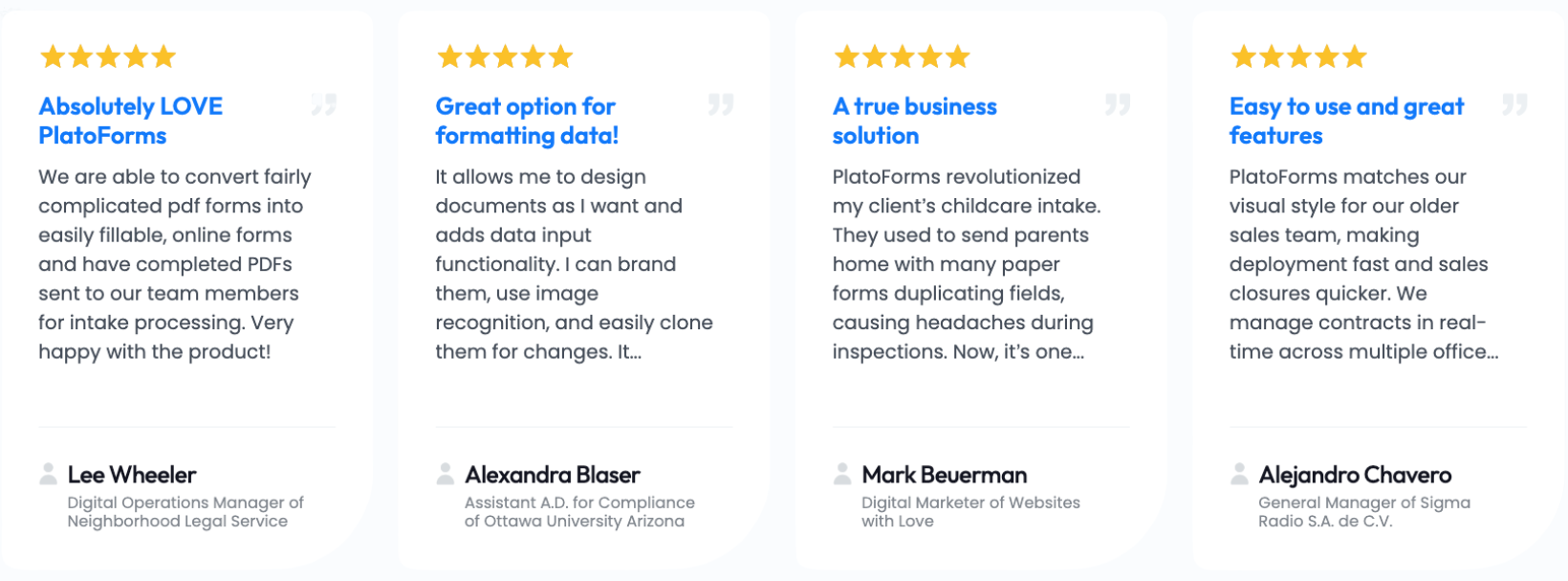 From drag-and-drop tools to secure integrations, PlatoForms adapts to the unique needs of businesses, making form management more accessible and efficient. Trusted by professionals worldwide, we are committed to innovation, exceptional customer service, and delivering solutions that drive productivity.