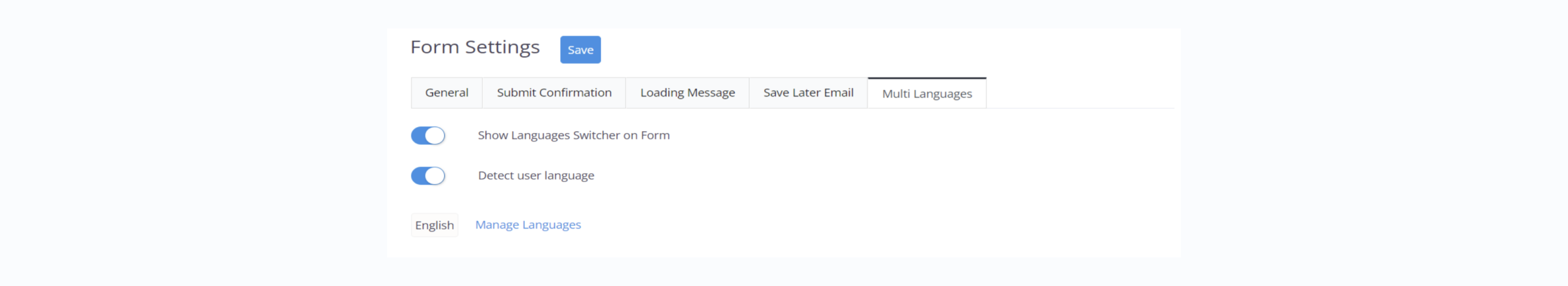 - Once the Form Settings window appears, navigate to the Multi Languages tab then click on Manage Languages.