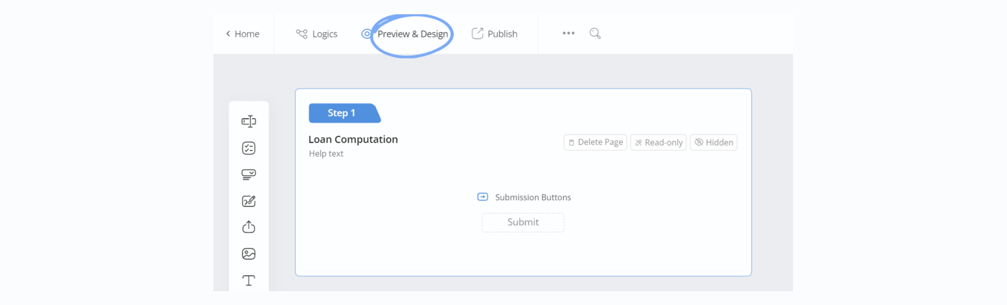 After adding fields and other elements to your online PDF form using the form builder, you can access the preview feature by clicking the Preview & Design button located at the upper row menu.