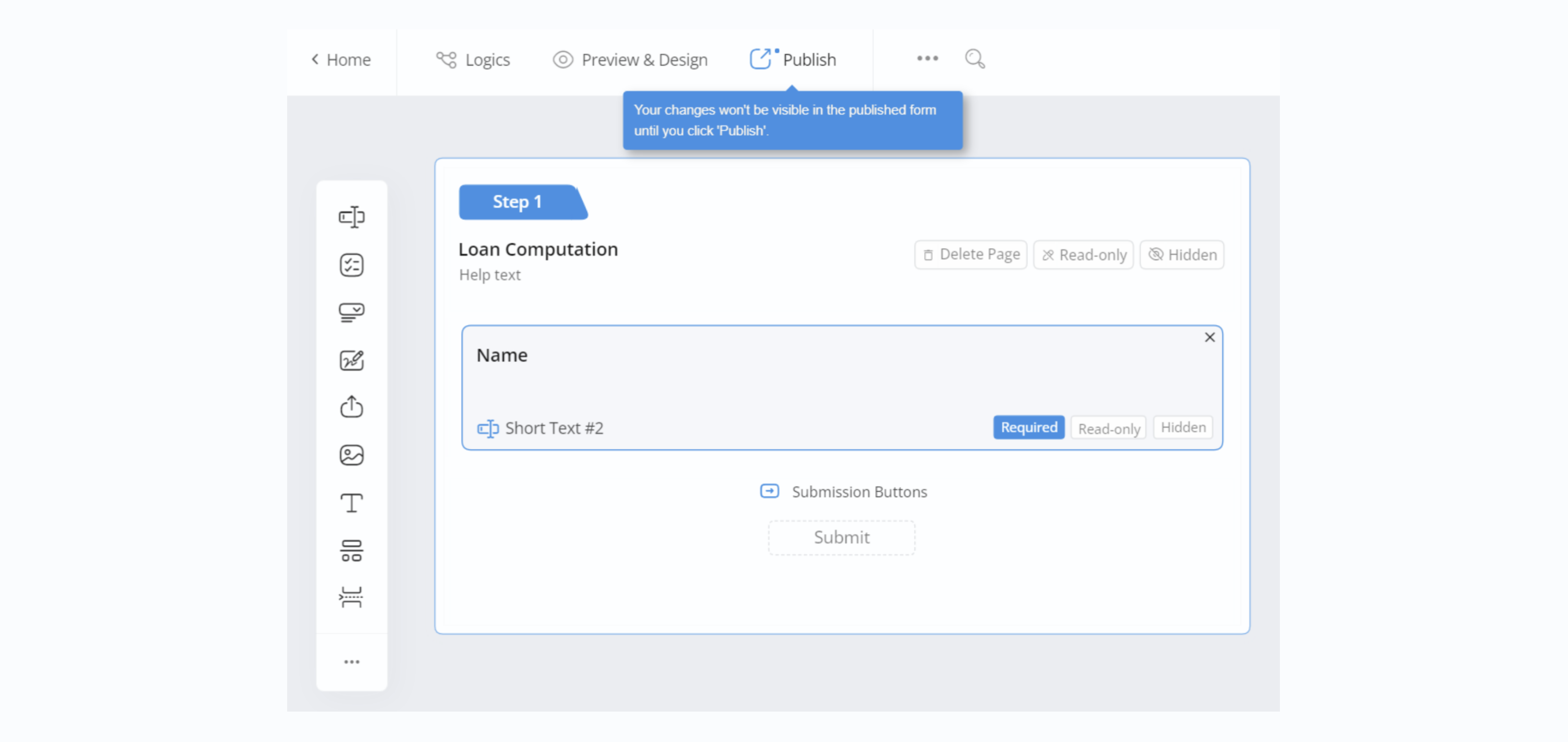 To get the published URL of your online PDF forms, you must first publish your form. To do that, simply click on the Publish button located at the upper row of menus.