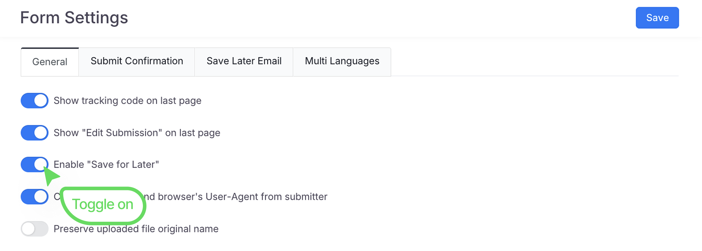 What happens: A “Save for Later” button appears on your form. Users click it, get a secure link, copy it or sent it to their email, and finish the form whenever they’re ready.