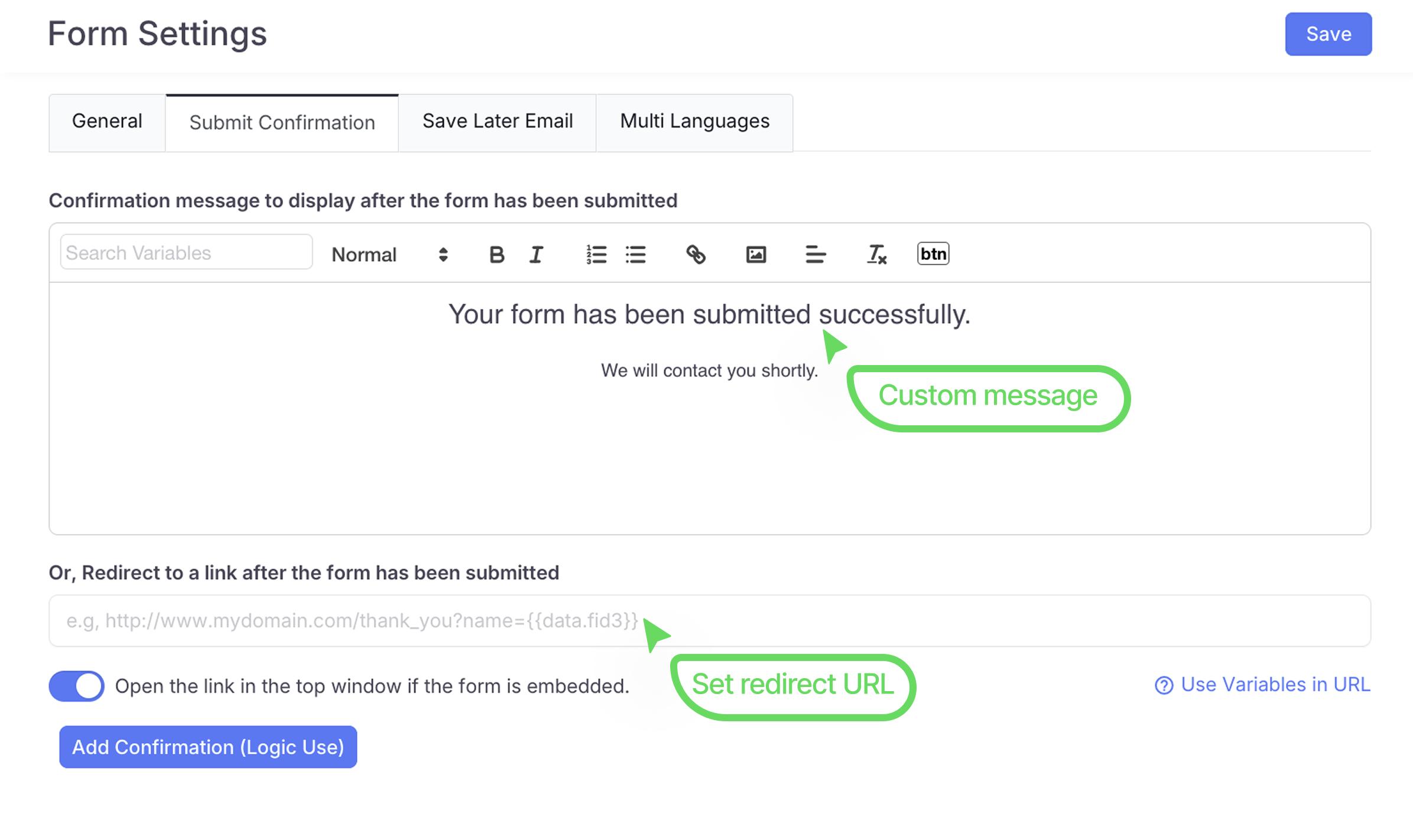 Add custom logic and flair with JavaScript - In Preview, go to Design Form > More Custom Styles > JS Tab to tweak labels, apply advanced logic, or animate elements—available for forms on custom domains.
