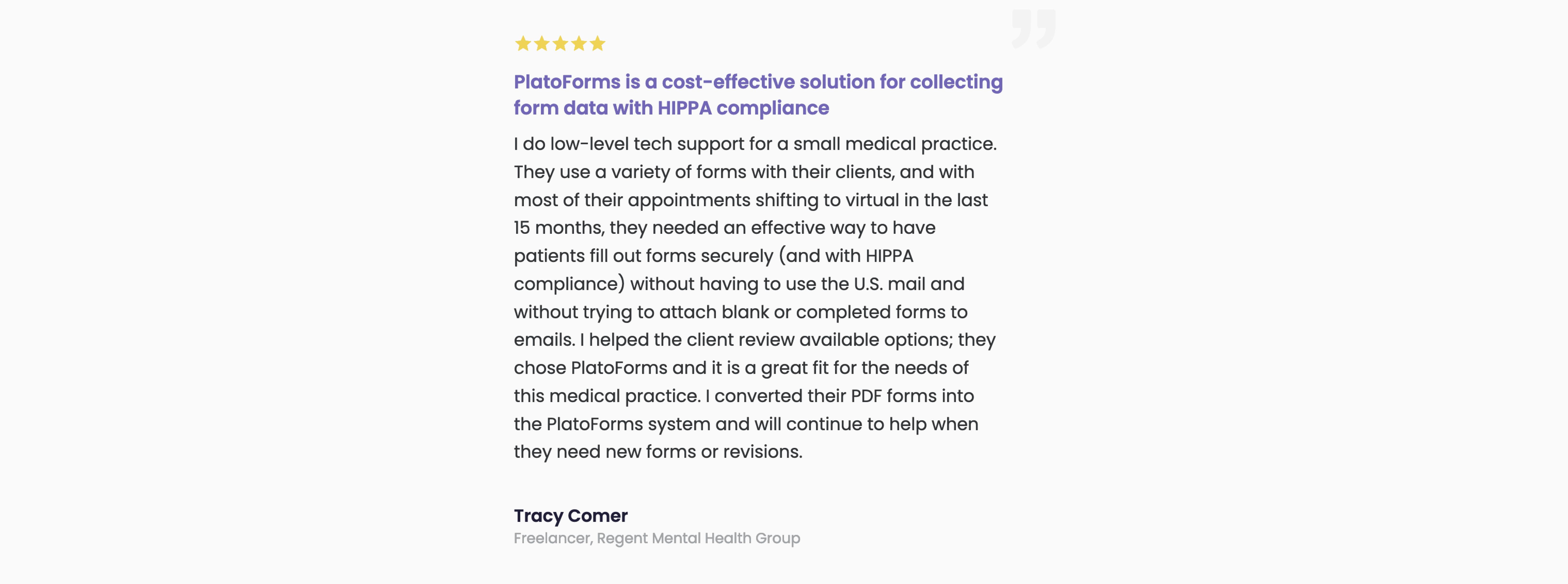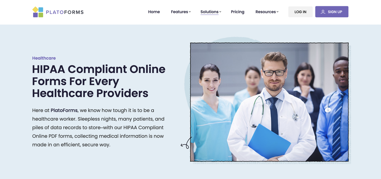 Encrypted data storage: No need to worry about your data silo with PlatoForms—all HIPAA-compliant forms are encrypted for security.