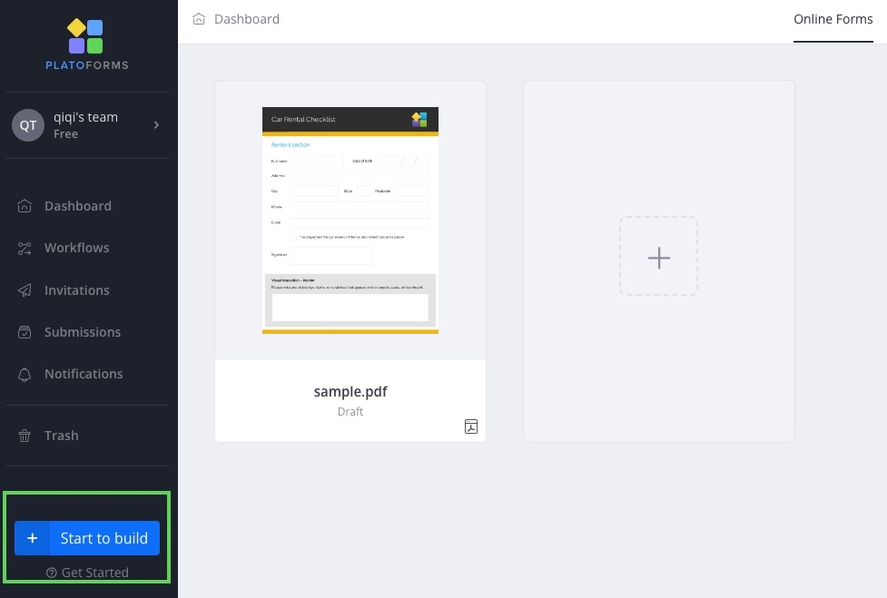 - Log in to your PlatoForms account and go to the online form builder. Navigate through the left column once you land in the dashboard and click the Start to build button.