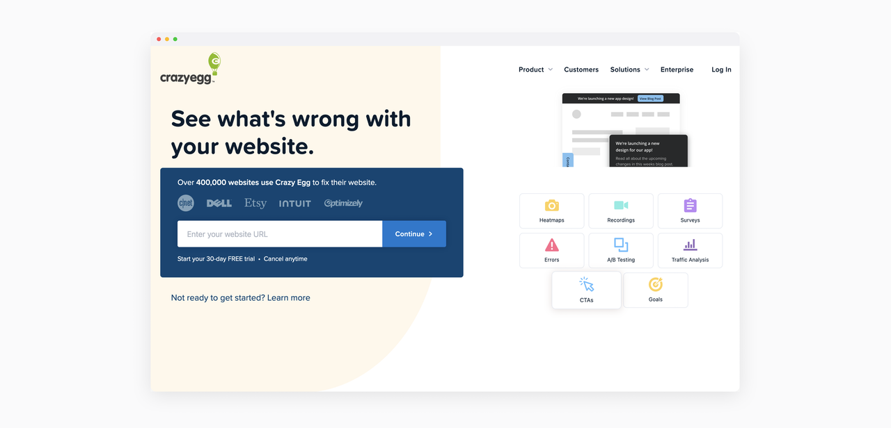 Crazy Egg’s homepage invites users to input their website for a personalized diagnosis, providing instant insights into potential issues. The platform emphasizes its credibility by showcasing the number of websites it has assisted, building trust and confidence in its services. This interactive and data-driven strategy efficiently engages users, offering a quick and effective way to understand the platform’s value.