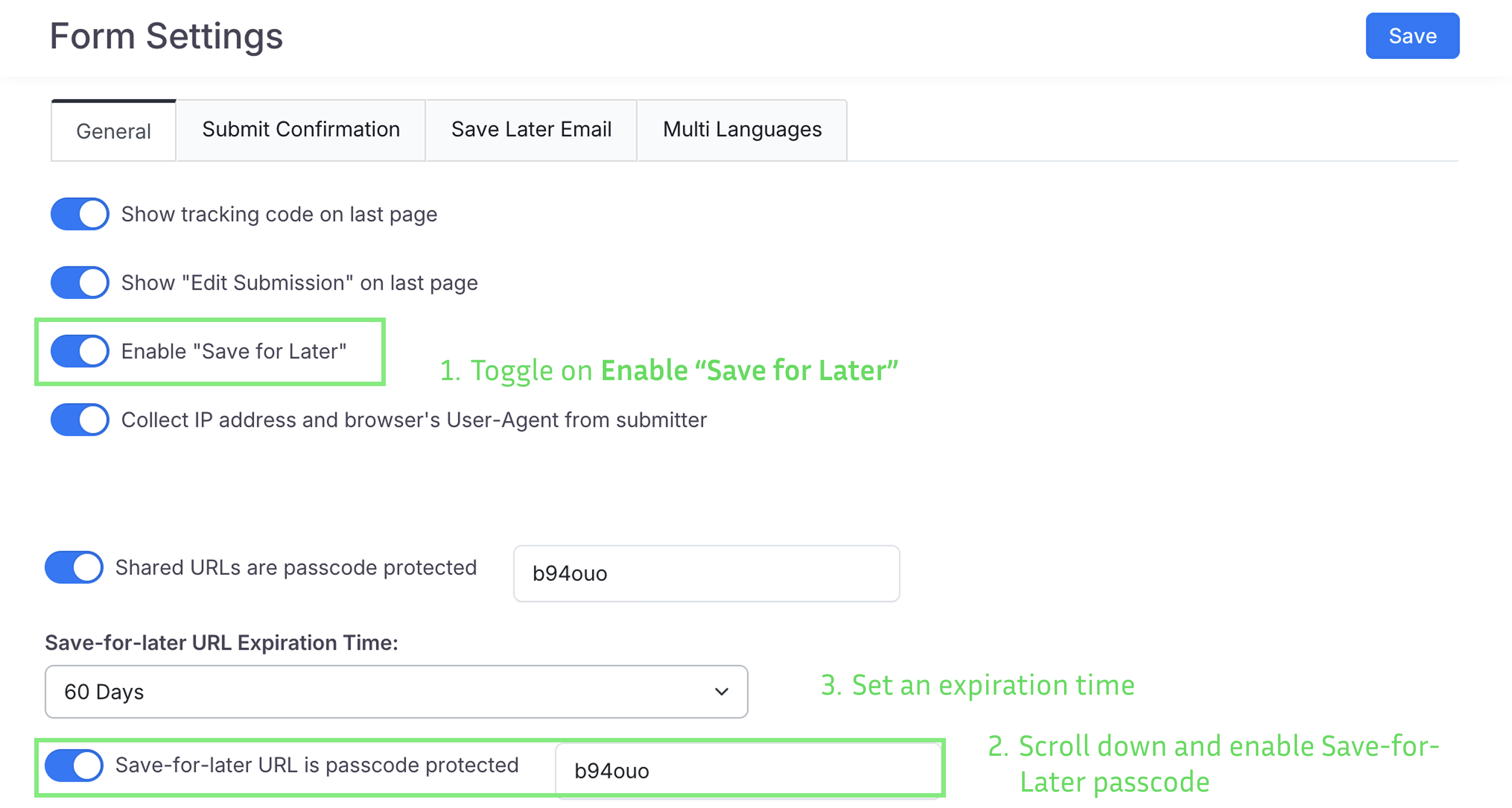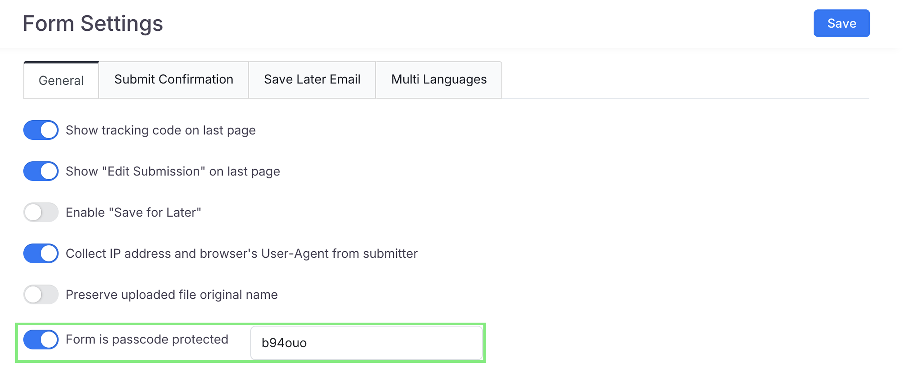 Go to Form Settings > Enable “Save for Later” > then enable “Save-for-later URL is passcode protected”.