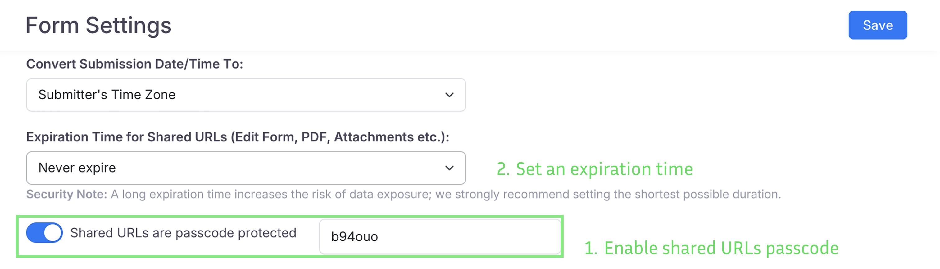 Go to Form Settings > Enable “Shared URLs are passcode protected”.