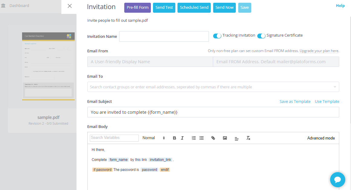 If you have specific email addresses for customers you want to send the form to, email is likely the most suitable method. PlatoForms also allows you to create and send personalized email invitations to your customers.