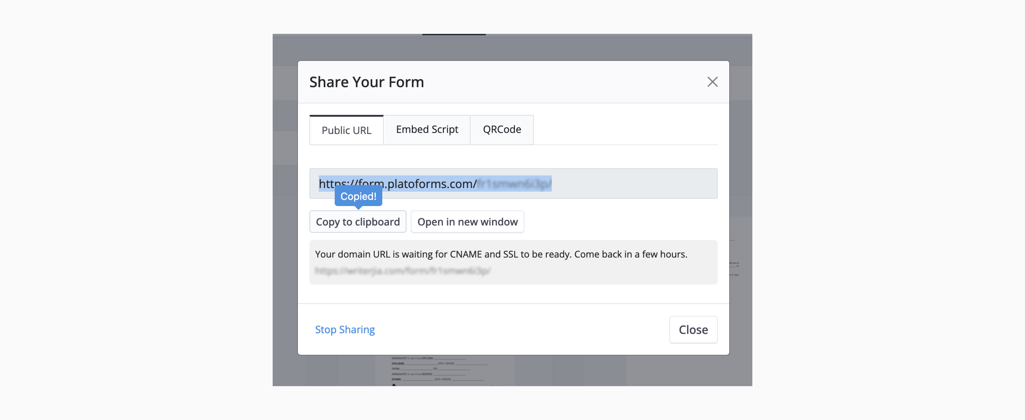 After publishing your online form, simply copy the form’s public URL in the expanded window.