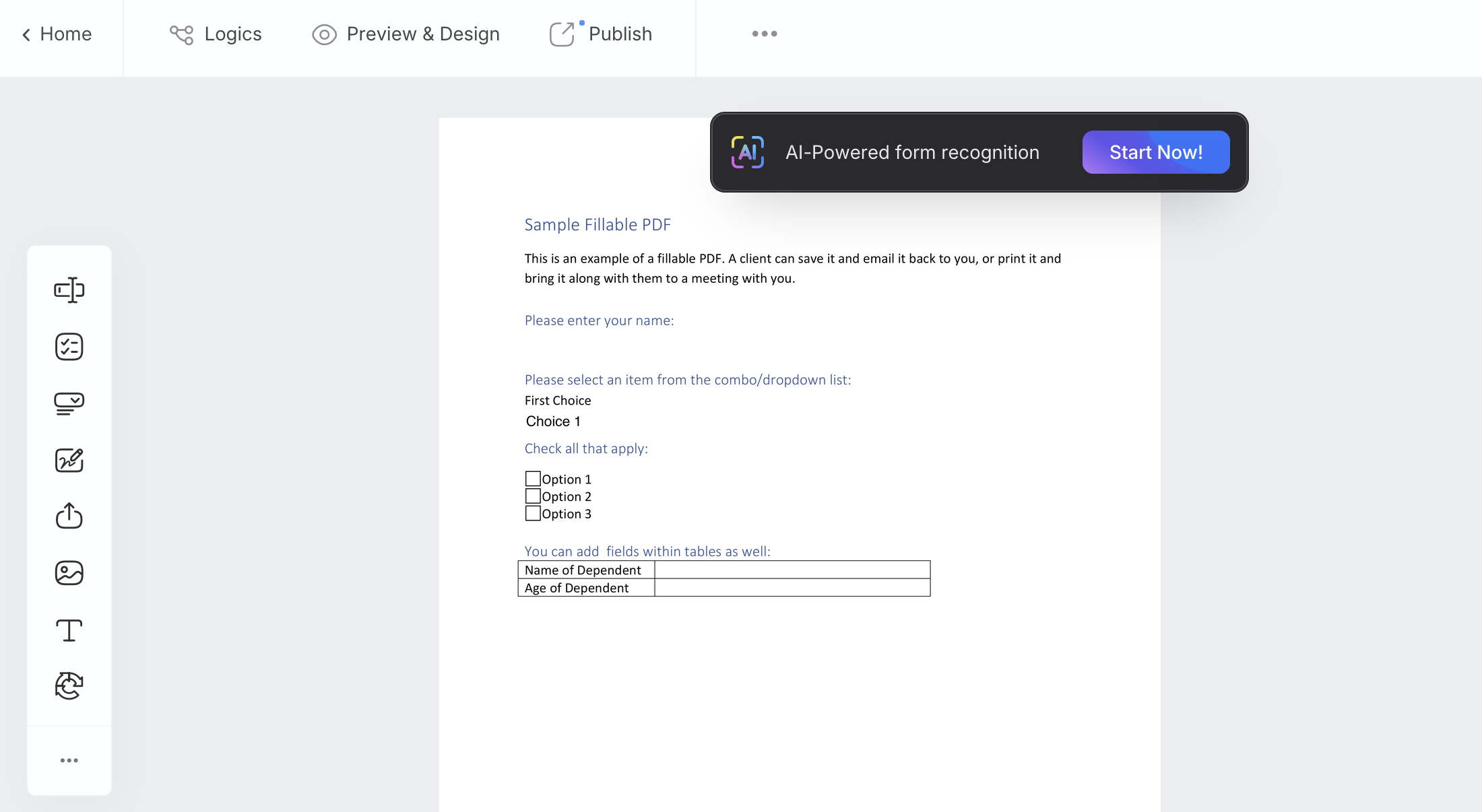 - Use AI Recognition to auto-detect fields, or add fields yourself.