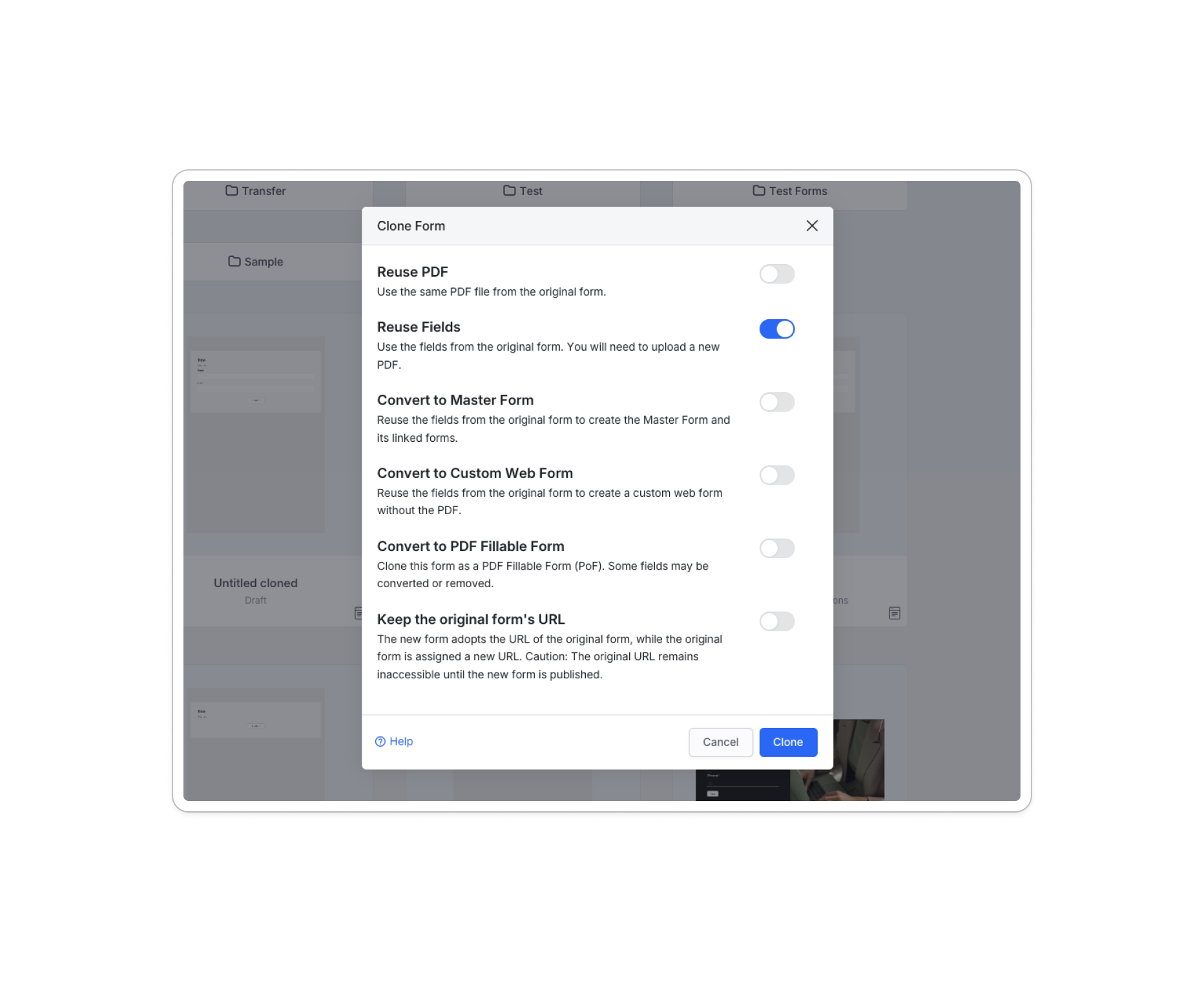 - Felder wiederverwenden: Verwenden Sie die Felder aus dem Originalformular, laden Sie jedoch ein neues PDF hoch.