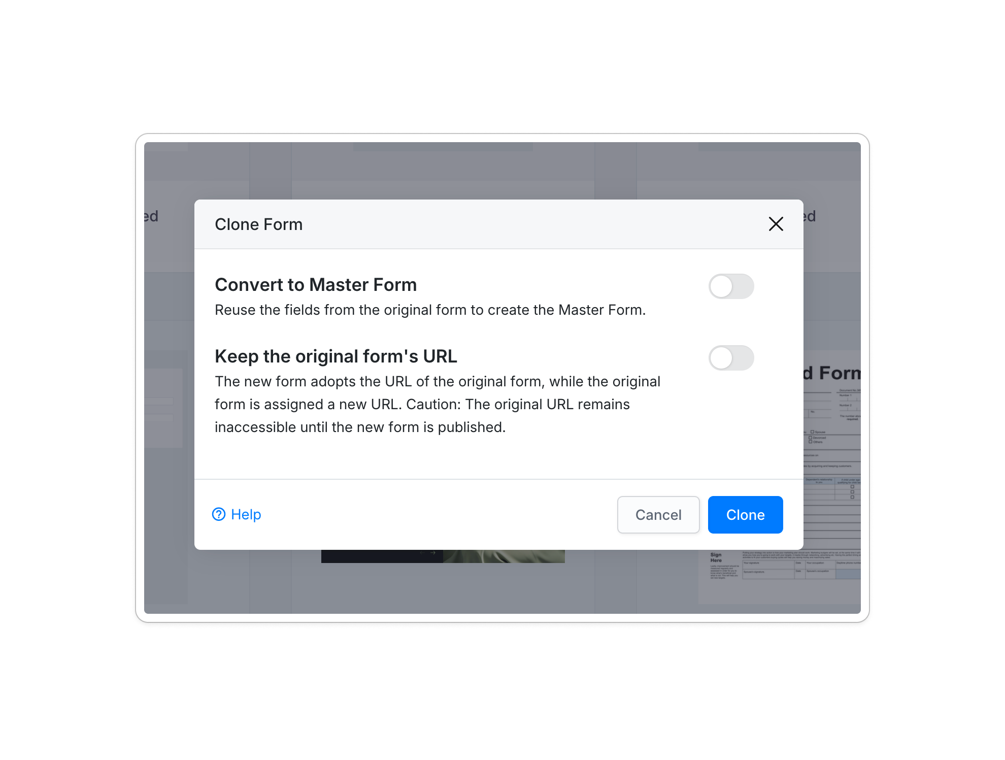 - Die URL des Originalformulars beibehalten: Das neue Formular übernimmt die URL des Originalformulars, während dem Originalformular eine neue URL zugewiesen wird. Beachten Sie, dass die ursprüngliche URL erst zugänglich ist, wenn das neue Formular veröffentlicht wird.