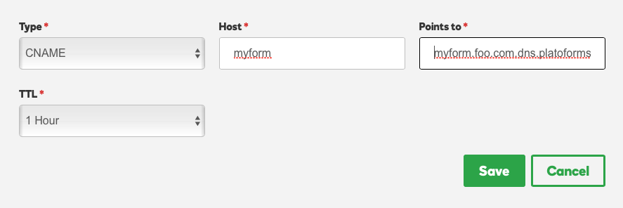 Once your CNAME record is set up correctly, your published forms will have a unique sharing URL that matches your custom domain name. For instance, it will look like this: https://myform.foo.com/form/fr1srsswes.