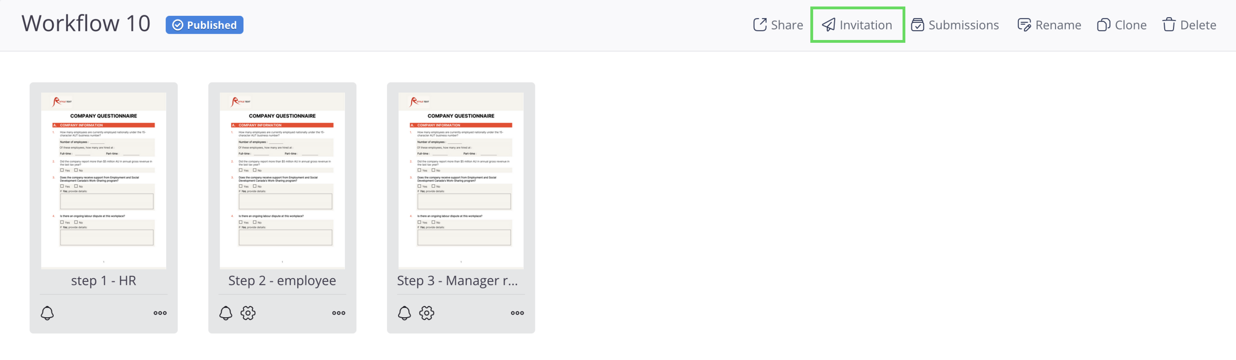 For the first step, click the Invitation button at the top right of the Workflow.