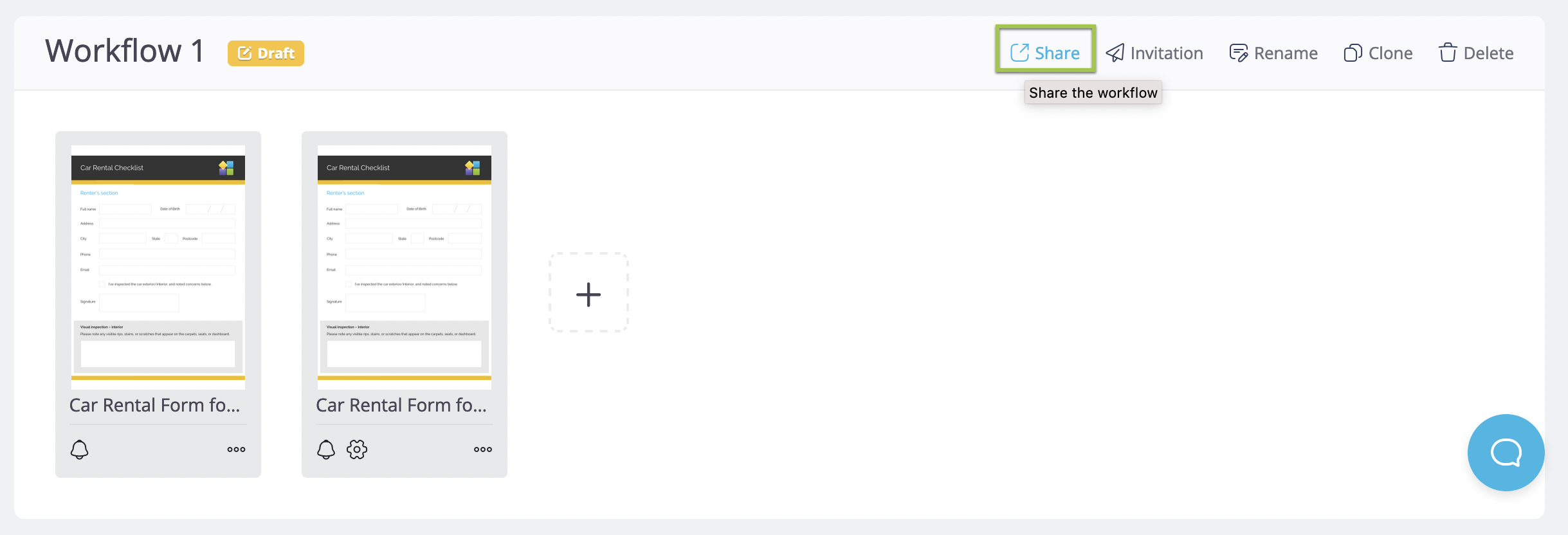 To share your Workflow, locate the action panel on the right side of your Workflow name and click Share.