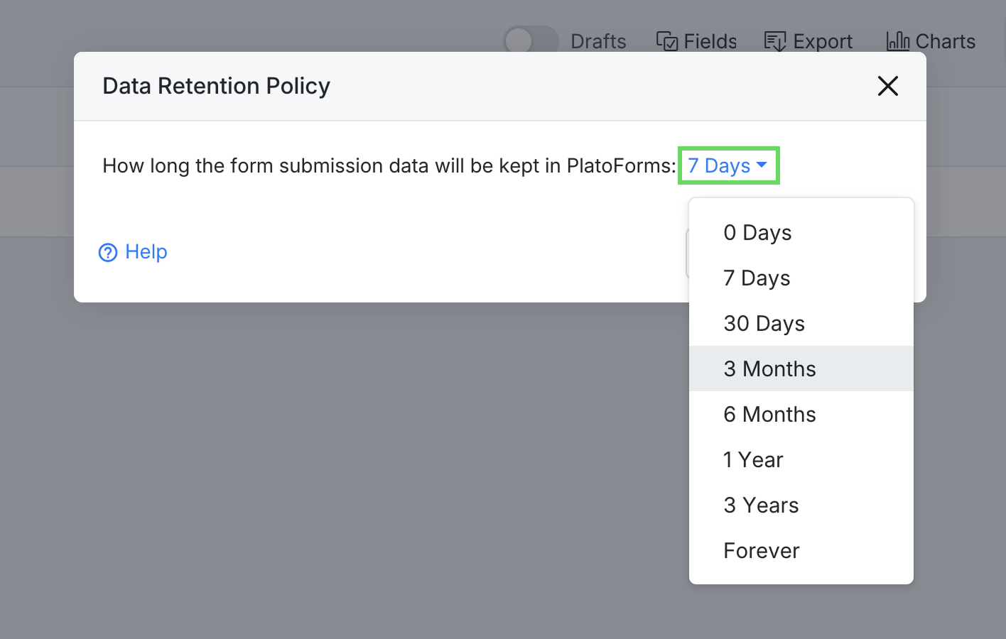 In the Data Retention Policy window, choose your preferred retention period from the dropdown.