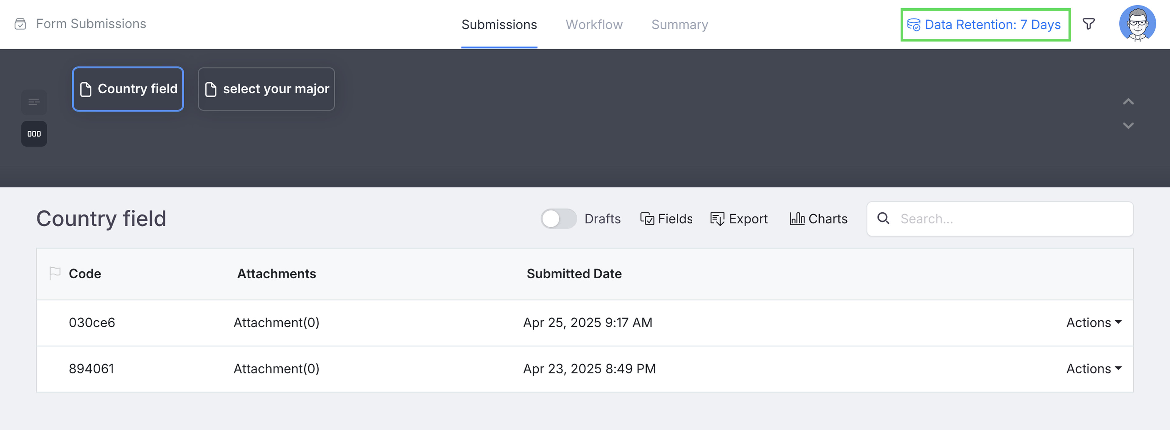 At the top-right of the Submissions page, click Data Retention to open the system-wide data retention settings.