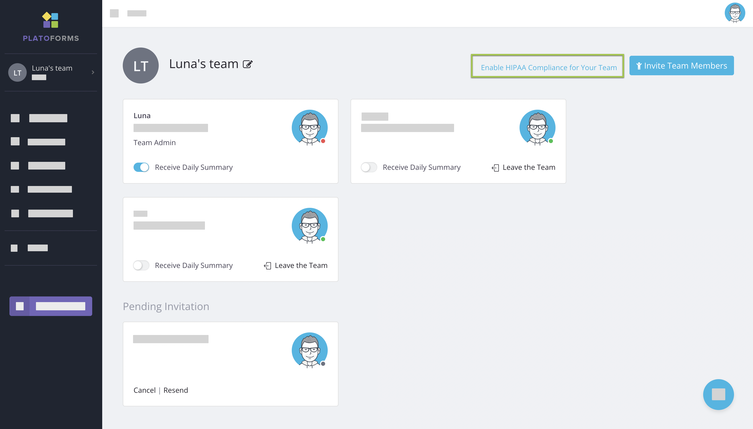 When a team is set to HIPAA-compliant, the Enable HIPAA Compliance option on the Team page will be replaced with the HIPAA compliance badge.