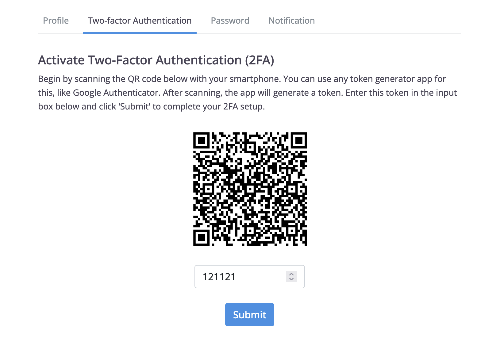 5. In the input box, enter the 6-digit code generated by your authenticator app, and click Submit
