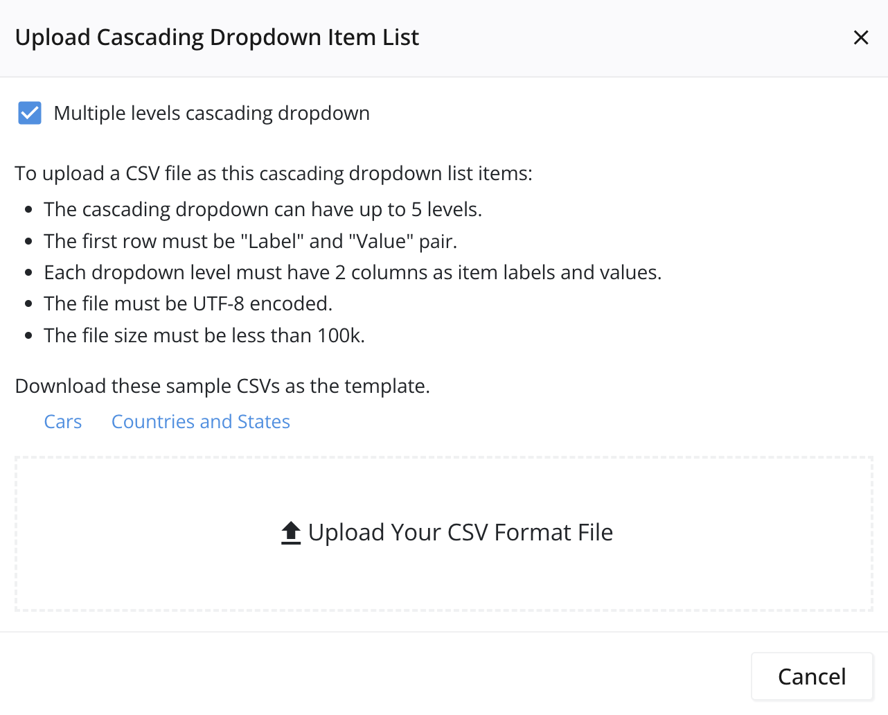 For each level in your CSV, PlatoForms will create a corresponding dropdown field in your form.