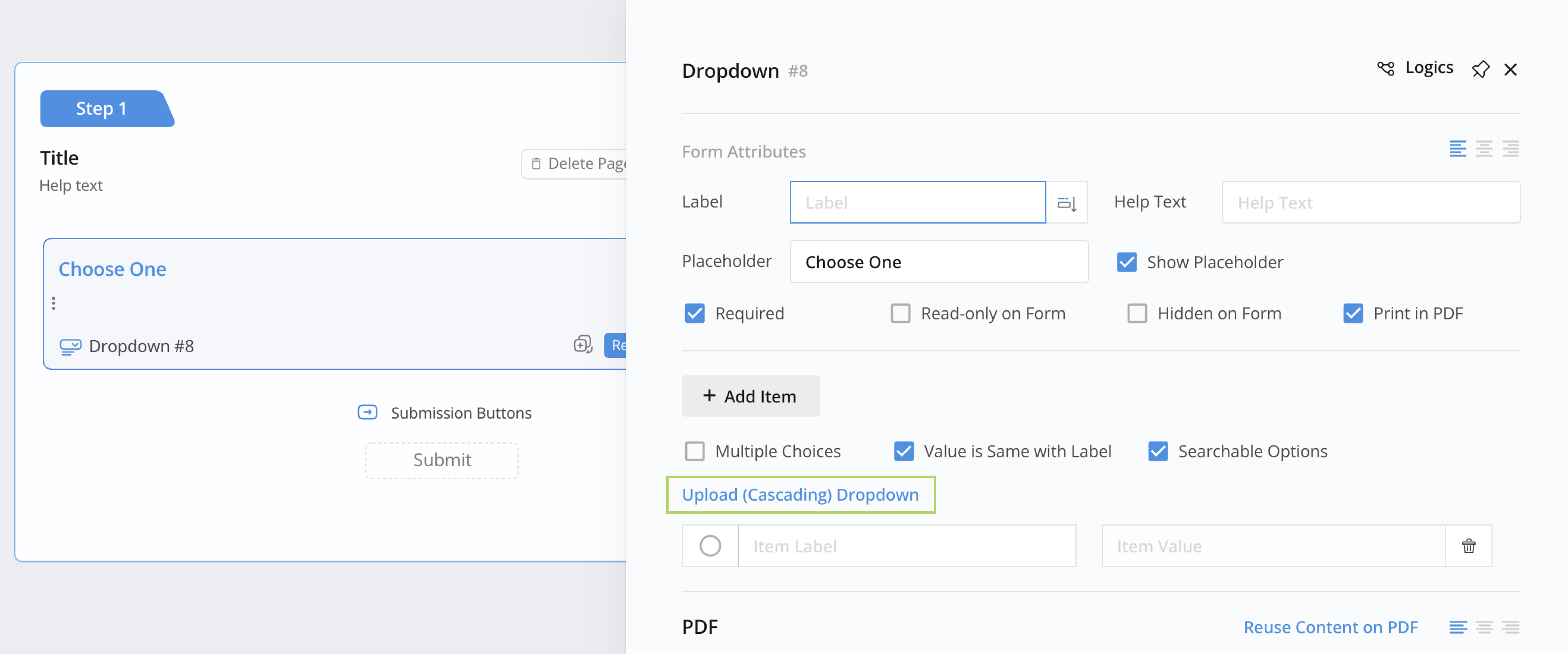 In the attributes panel, select Upload (Cascading) Dropdown.