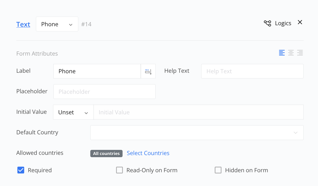 The Phone field offers several attributes that allow you to customize its behavior and appearance to suit your form’s needs.