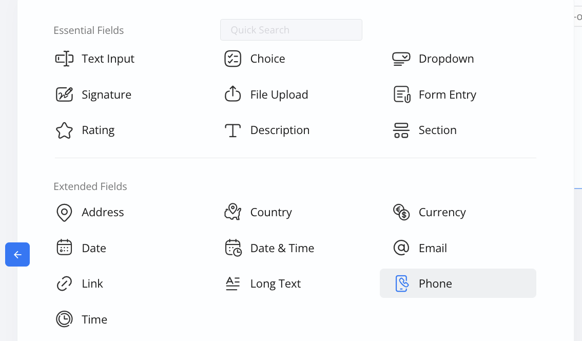 To add a Phone field, in the left Toolbar, click the small ••• (More Widgets) icon, and select the Phone icon under Extended Fields.