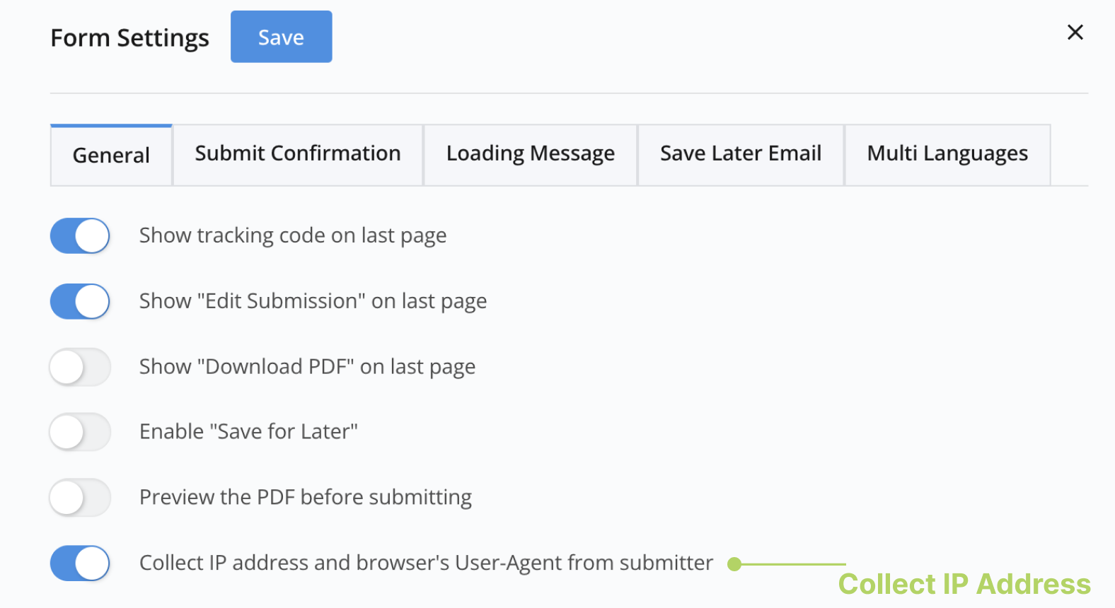 If you’ve enabled the Collect IP address and browser’s User Agent from submitter option in the General tab of Form Settings, setting the Initial value to IP Address will print the submitter’s IP address to the respective field after form submission.