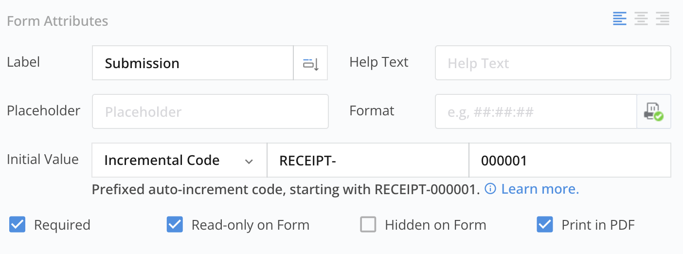 You can generate unique PDF codes using the incremental code initial value. Set a prefix like RECEIPT- and an initial seed value such as 00001. The code increases with each submission, creating unique codes like RECEIPT-00001, RECEIPT-00002, and so on, automatically in live forms.