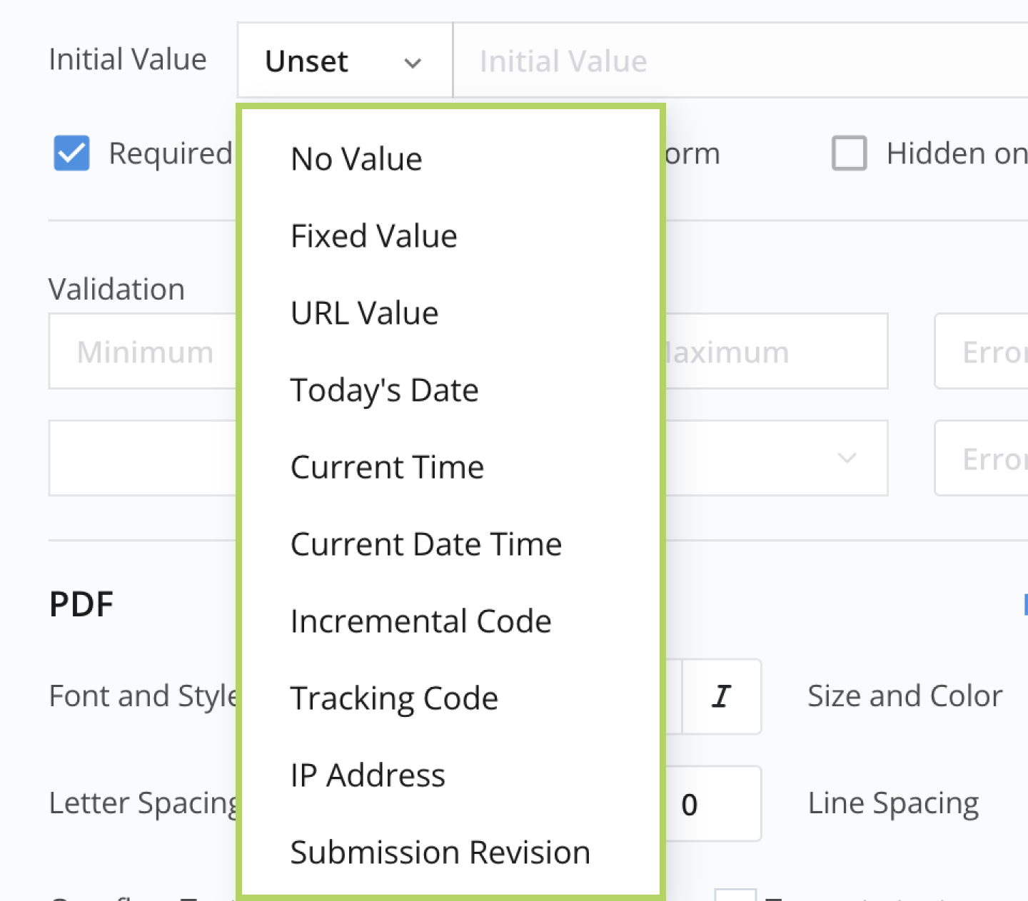 An initial value for a Text field is a default value automatically inserted into your online forms. It’s useful for adding preset information, like today’s date, to the form. Respondents will see these values pre-filled in the Text field when accessing the form, and they’ll also appear in the PDF.