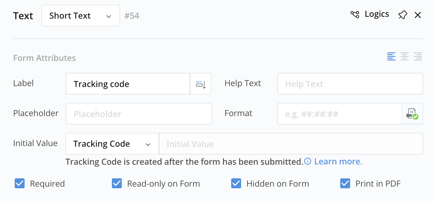 You can set the Initial Value to Tracking Code. When you print the PDF, it links the PDF to form data. However, note that the Text Input field using this Tracking Code as its initial value becomes invisible on the form because the Tracking Code doesn’t exist when the user submits the form.
