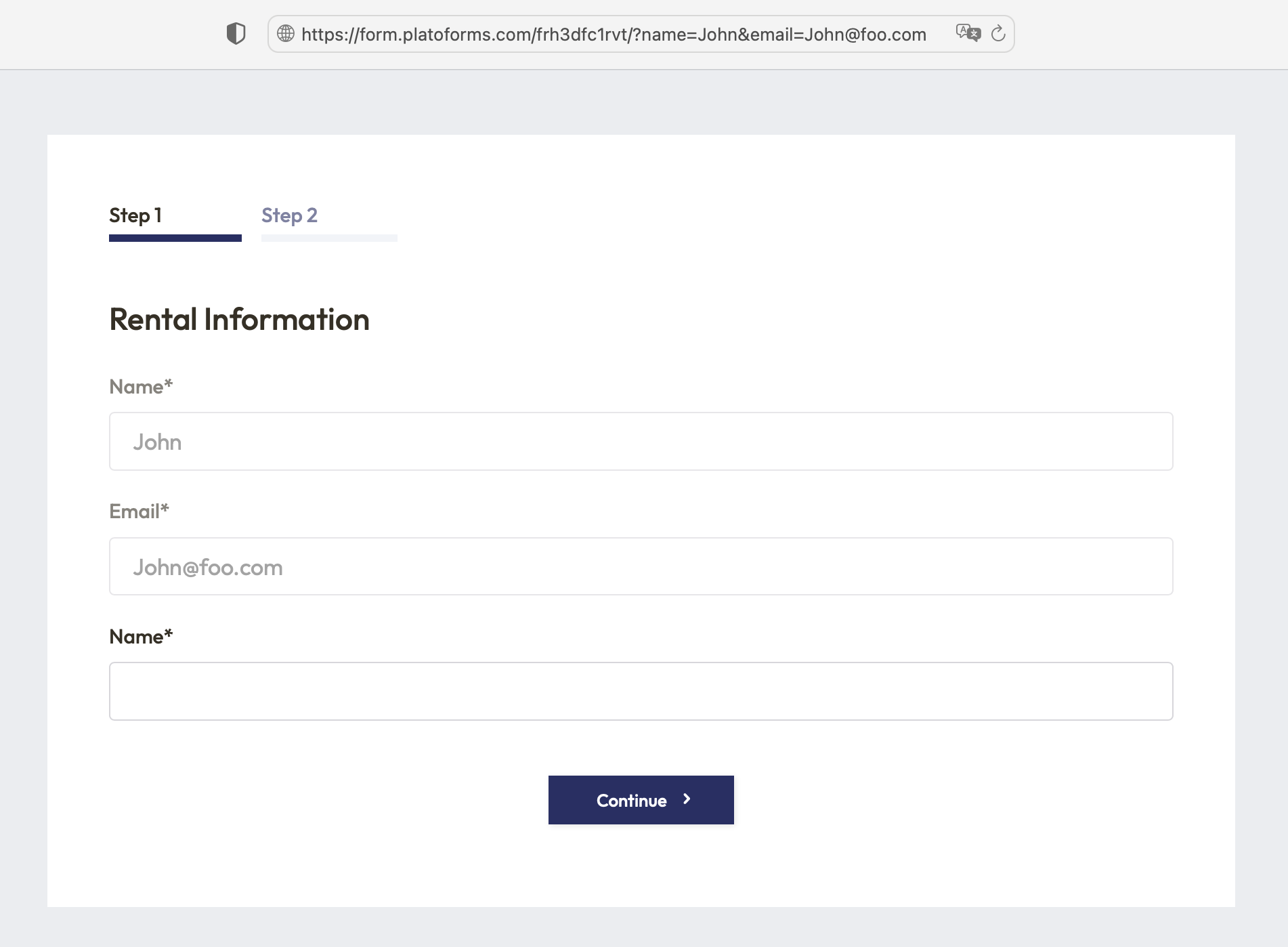 Now, when you open the form’s URL and add ?name=John&email=John@foo.com to the end, both fields will automatically populate with the specified values. You can send this URL to users, saving them the trouble of manually entering this information.