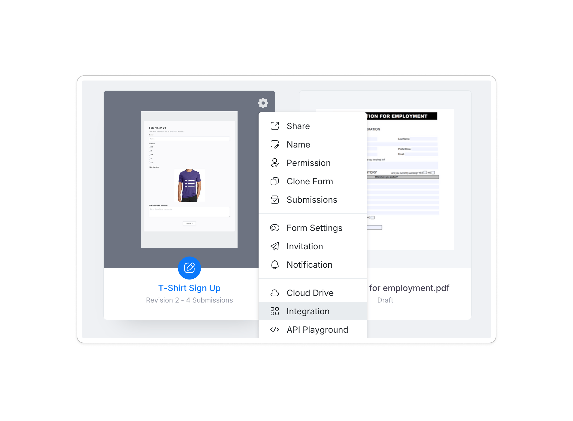 In PlatoForms, open the form you want to connect and go to Settings > Integration.