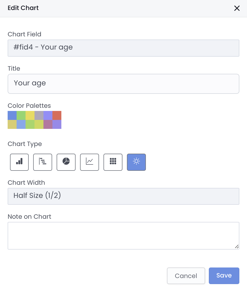 PlatoForms supports 6 different chart types for visualizing your data. When the report is first generated, each field’s chart will be assigned a random type. You can change the chart type afterward.