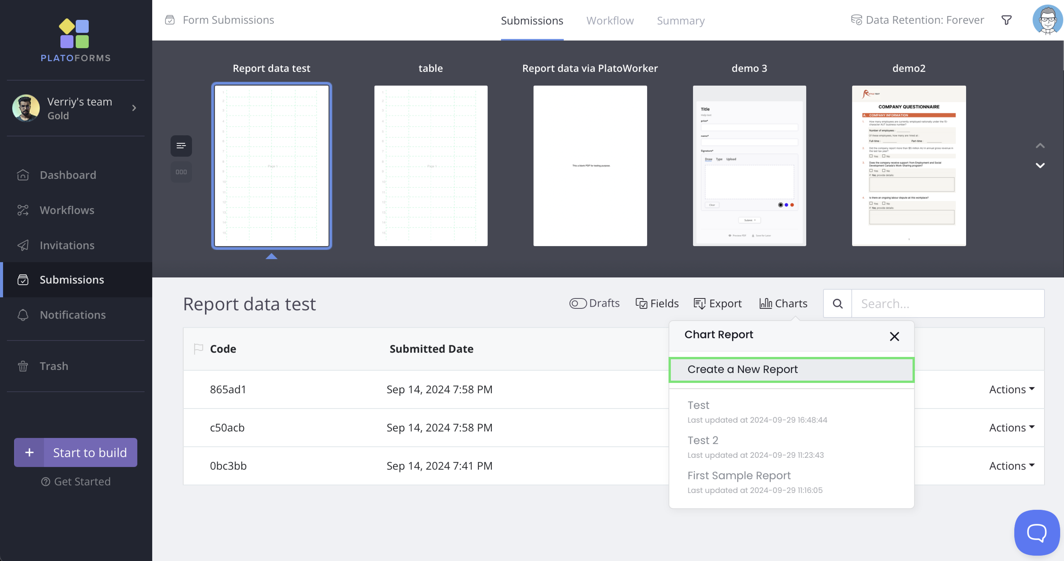 Select the form for which you want to generate a report, and click Charts > Create a New Report.
