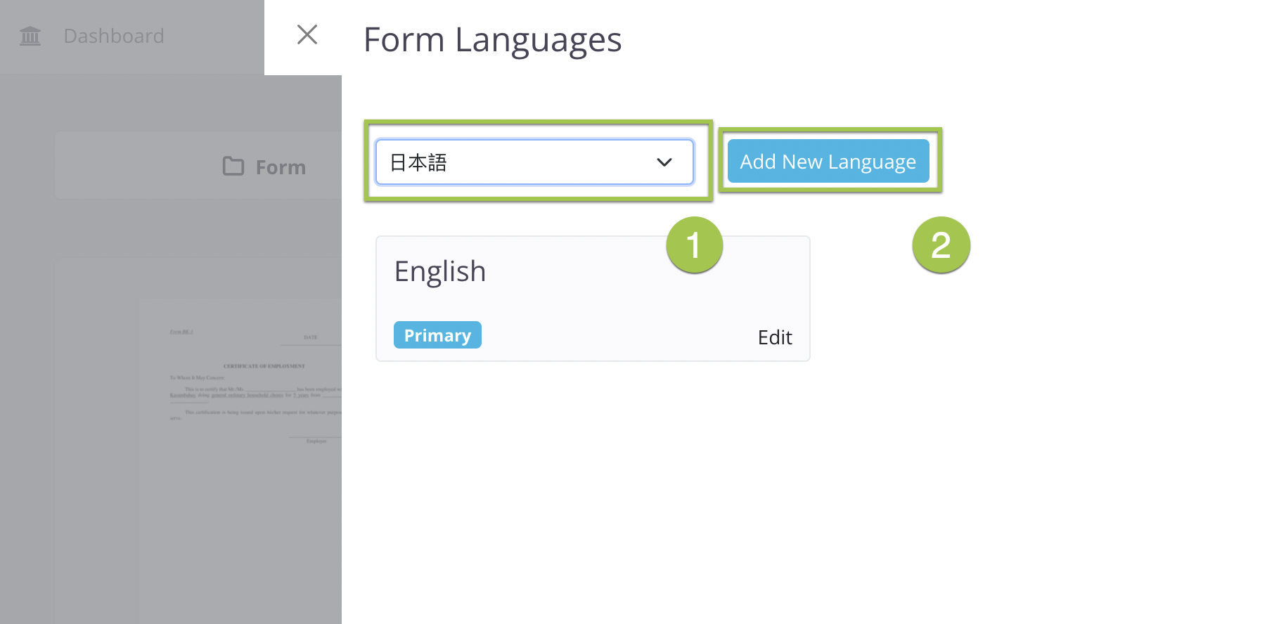 In the Form Languages window, select a language from the dropdown, and click Add New Language.