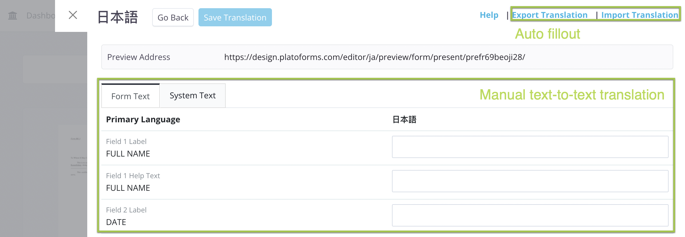 - For manual translation: Switch between Form Text and System Text tabs to add text-to-text translations manually.