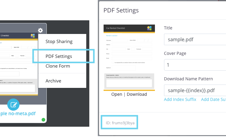 shared_pdf_linkandattach_pdf_file: With a Master form, there can be several PDF files. If you only want to share or attach certain PDF files, you can specify a PDF ID likeshared_pdf_link.frums9j3byaorattach_pdf_file.frums9j3bya. You’ll find this PDF ID in the “Name” section by clicking on the form menu on the PDF cover of that particular linked PDF.