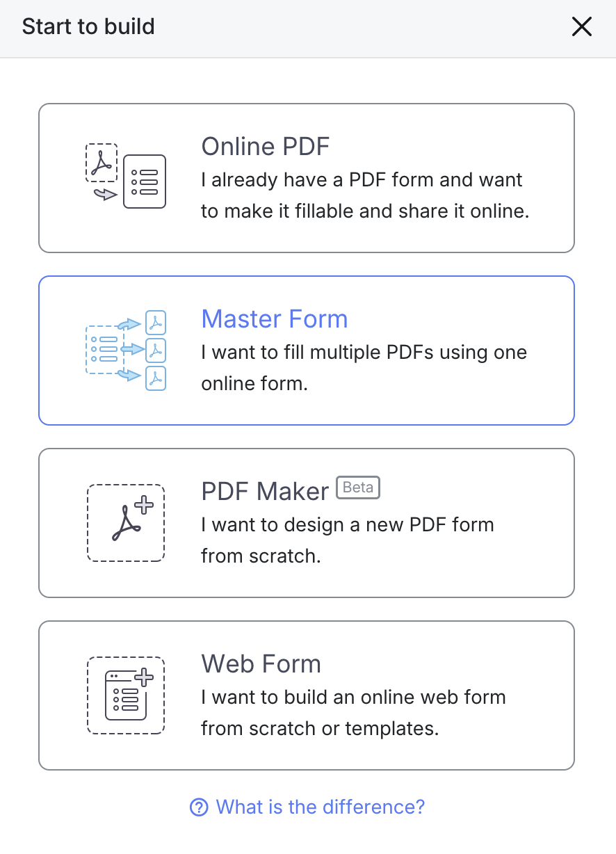 - Start with a Master Form that isn’t linked to a PDF. After editing it, upload PDFs to create linked PDF forms. Use the link form editor to connect a widget from the Master Form to a PDF.