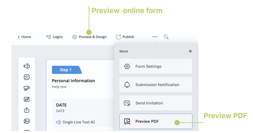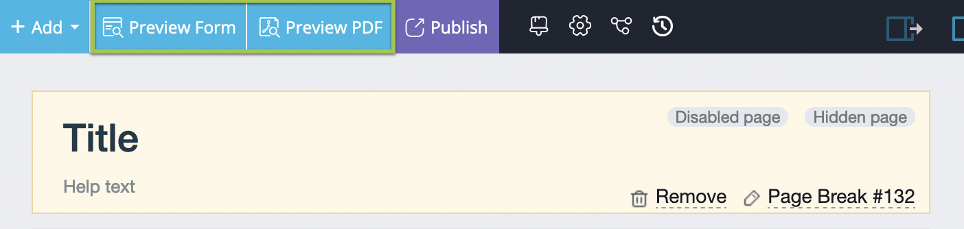 Click the Preview Form and Preview PDF buttons in the top left corner. Check the Preview web PDF form section for details.