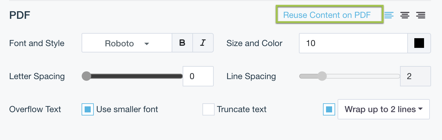 Scroll down the left panel to the PDF section, and click Reuse content on PDF.