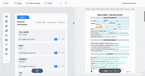 For form with multiple pages, you can navigate them by using the Page Toggle Located at the bottom of both the left and right panels.