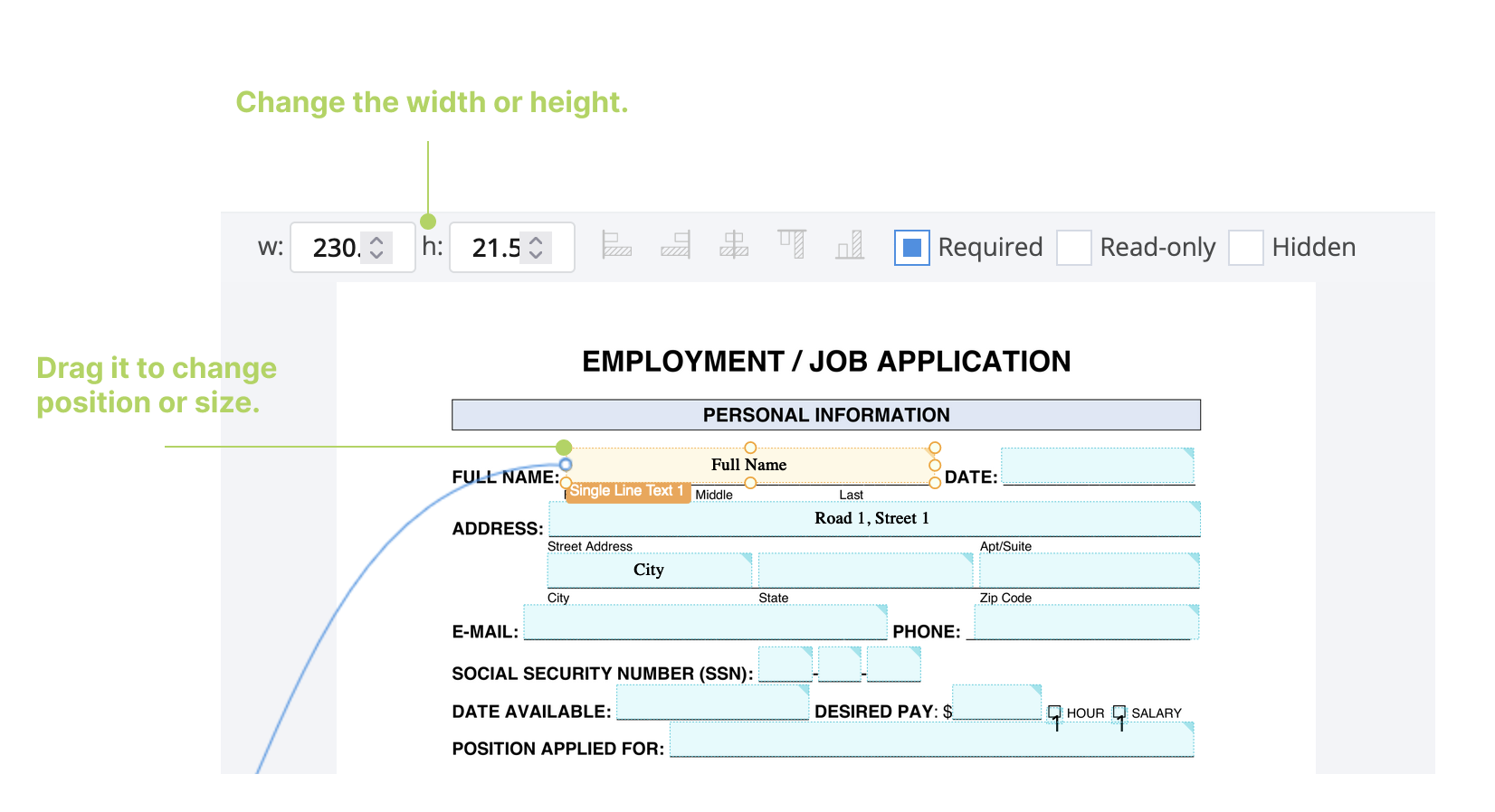 Resize the widget by dragging any of its four sides or manually entering the width or height after selecting a specific field widget.