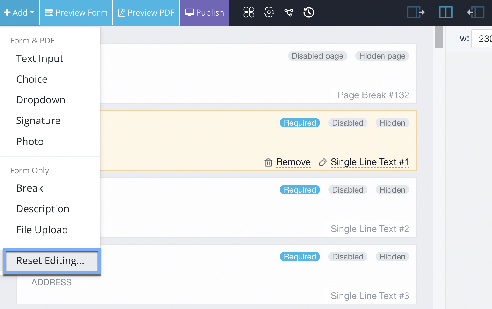 In the old form builder, click + Add at the top left and choose Reset Editing from the menu.