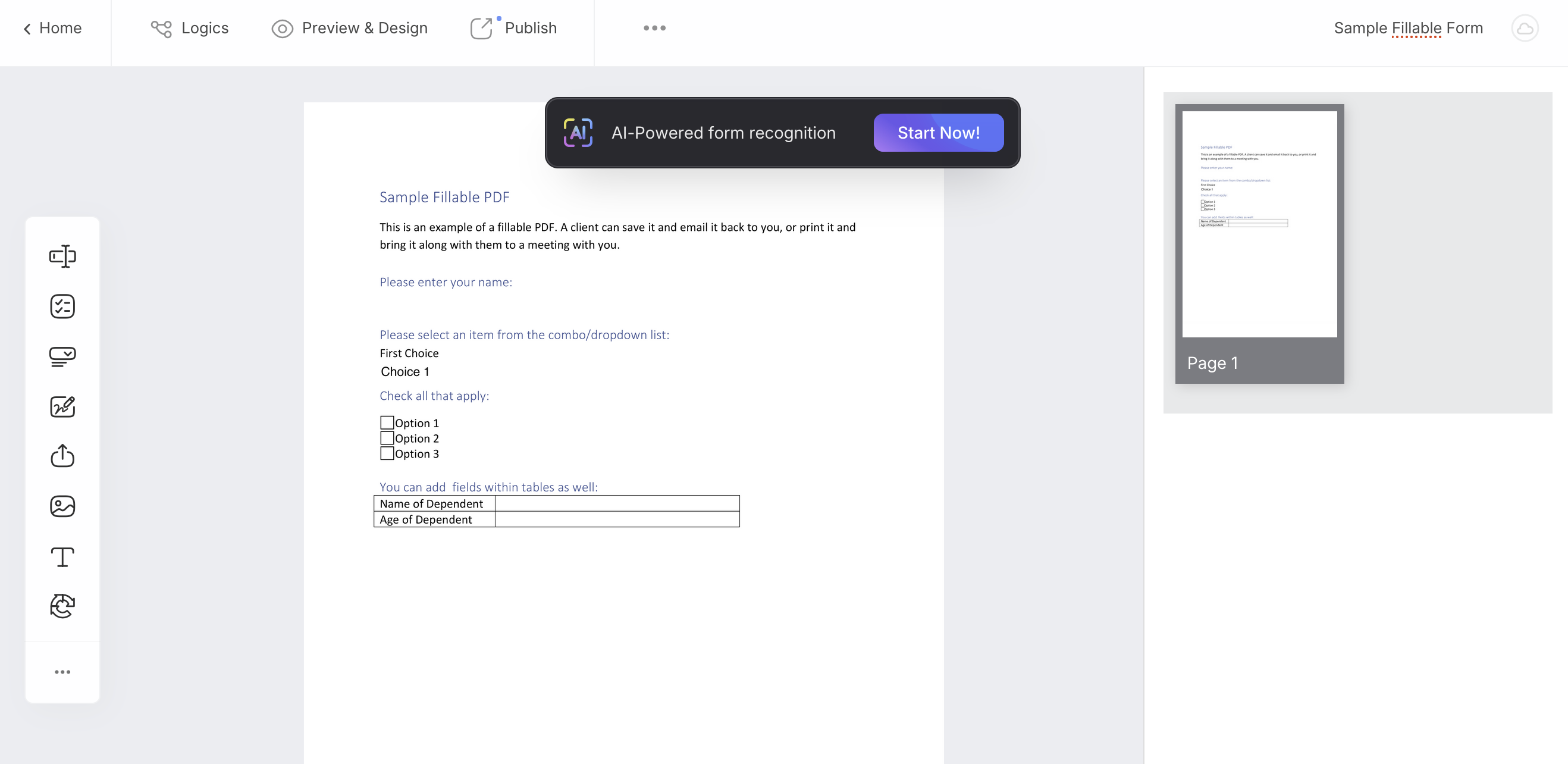 After uploading, you’ll see the AI-Powered form recognition bar. Click Start Now!.