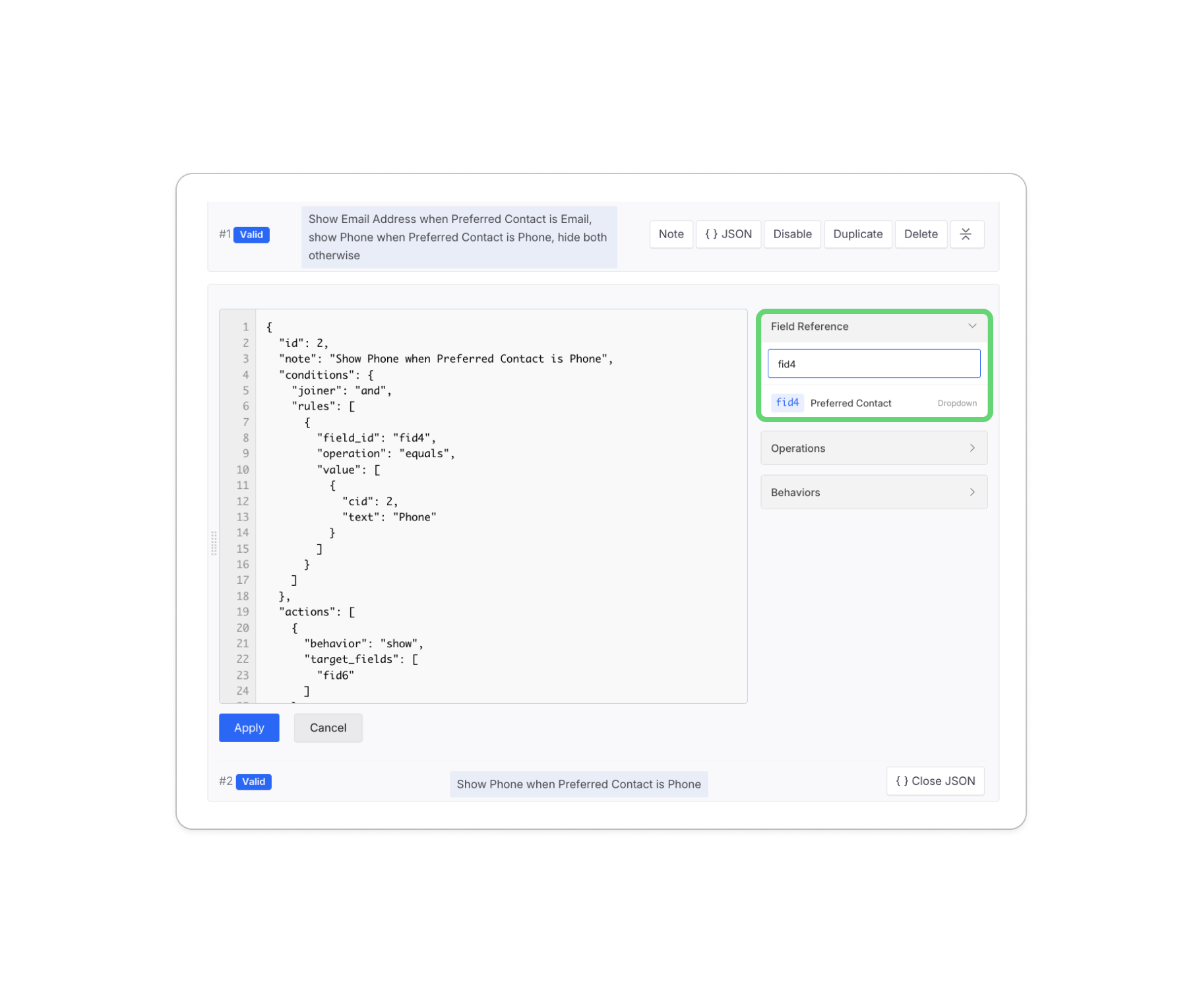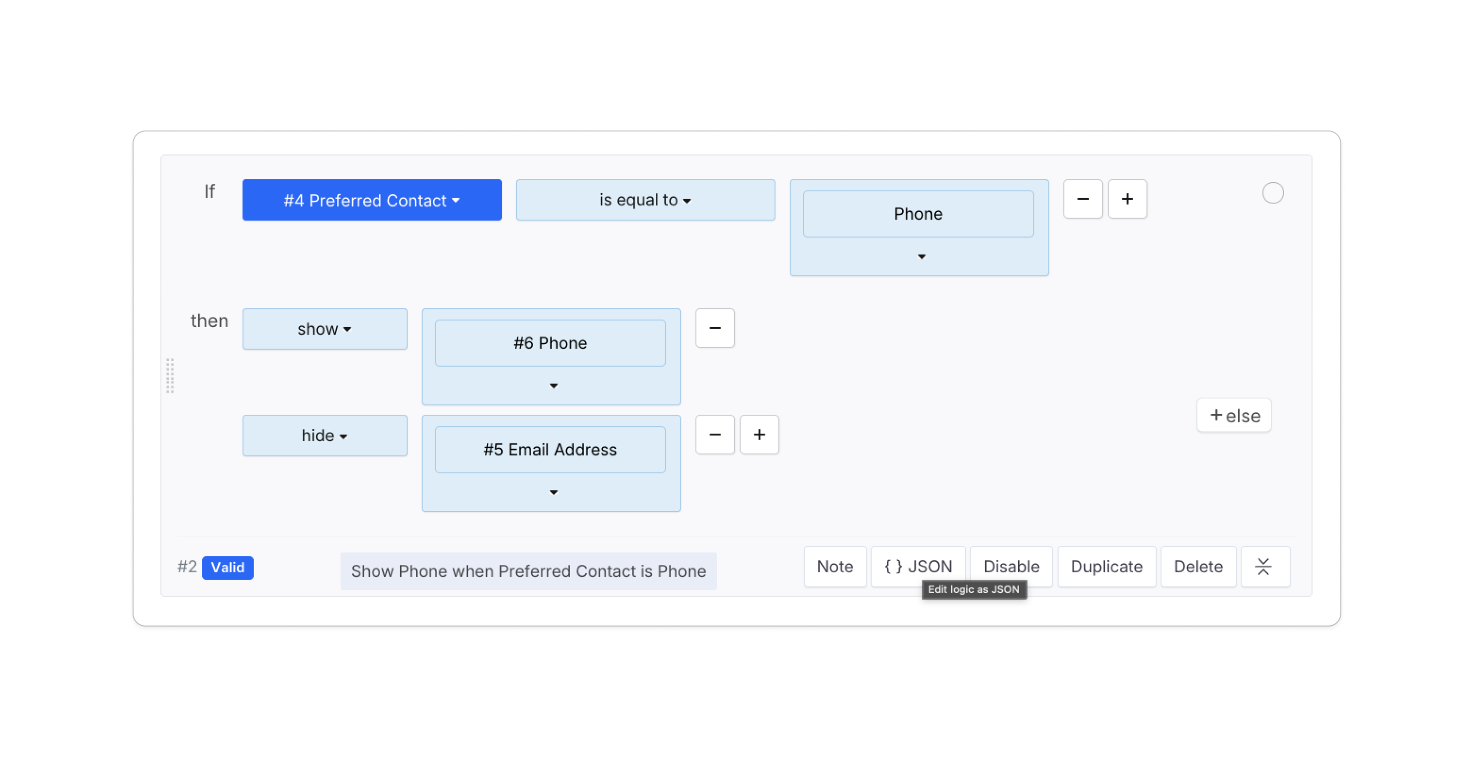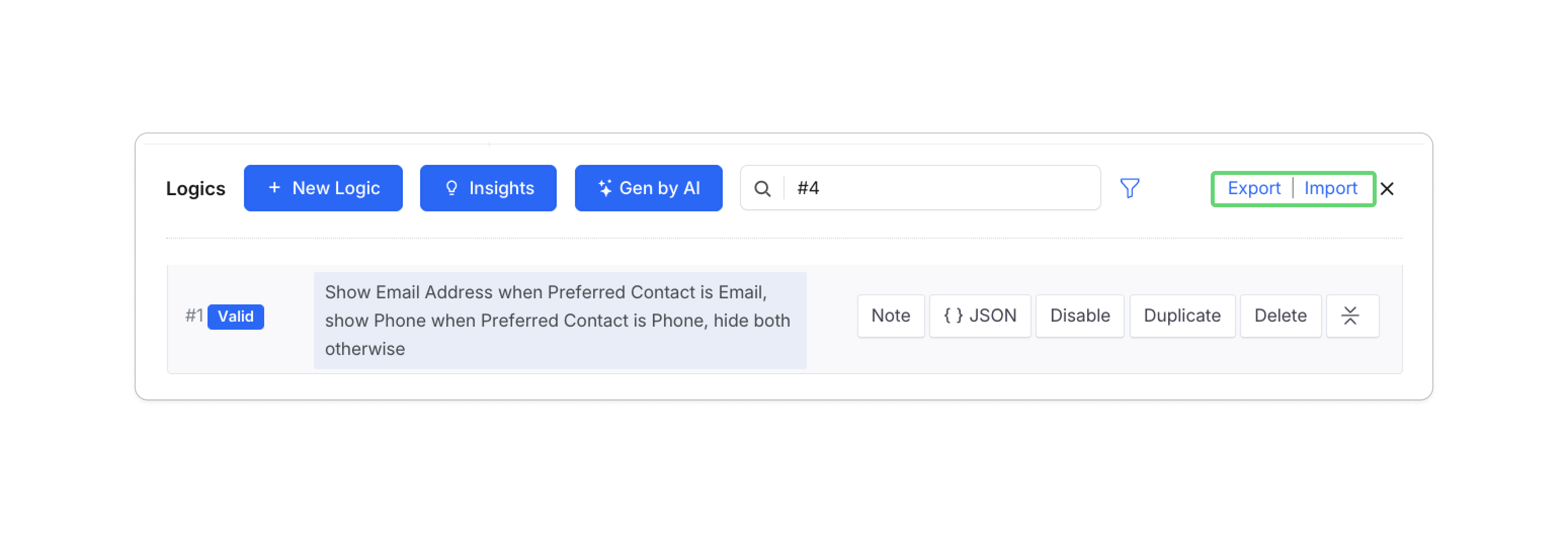 • Exportar: Descarga todas las reglas de lógica existentes como un archivo JSON para respaldo o para usar en otro formulario.