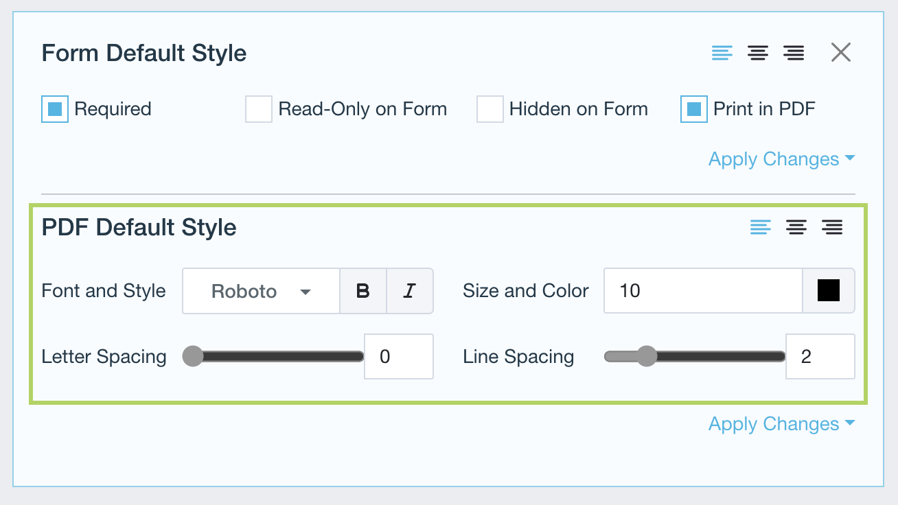 Within the PDF Default Style section, adjust the font style for your fields, including: