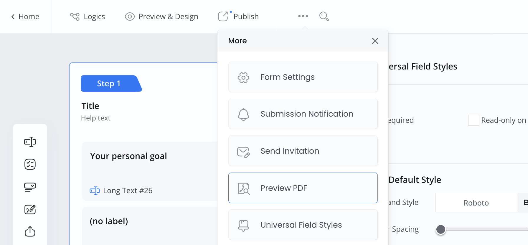 In the new form builder, navigate to the top left corner, click ••• > Preview PDF.