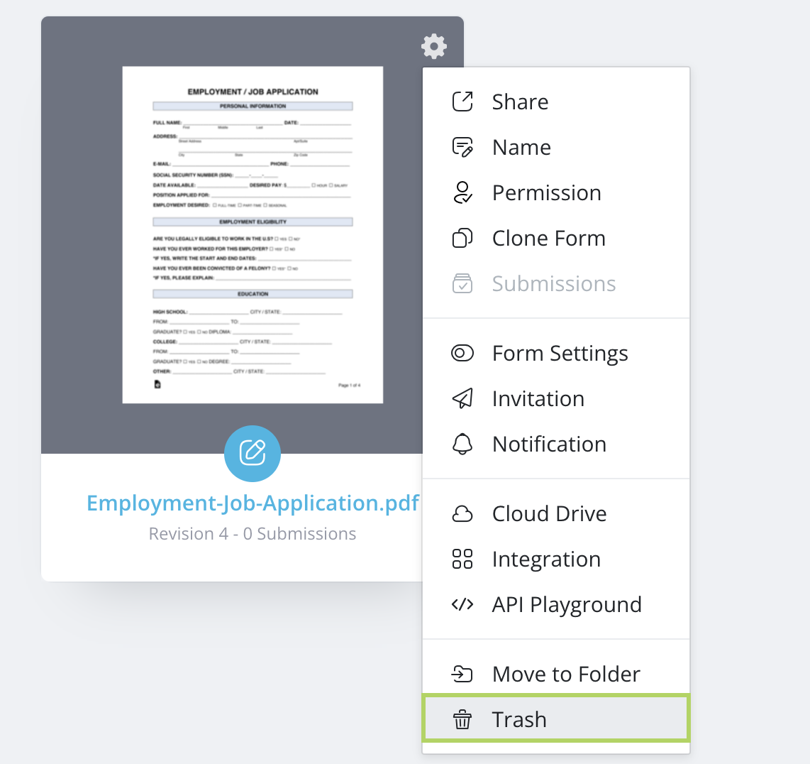 You can move forms that are no longer needed or have become outdated to the trash. Trashing a form removes it from your active forms, which can help you free up capacity for new forms. Here’s how: