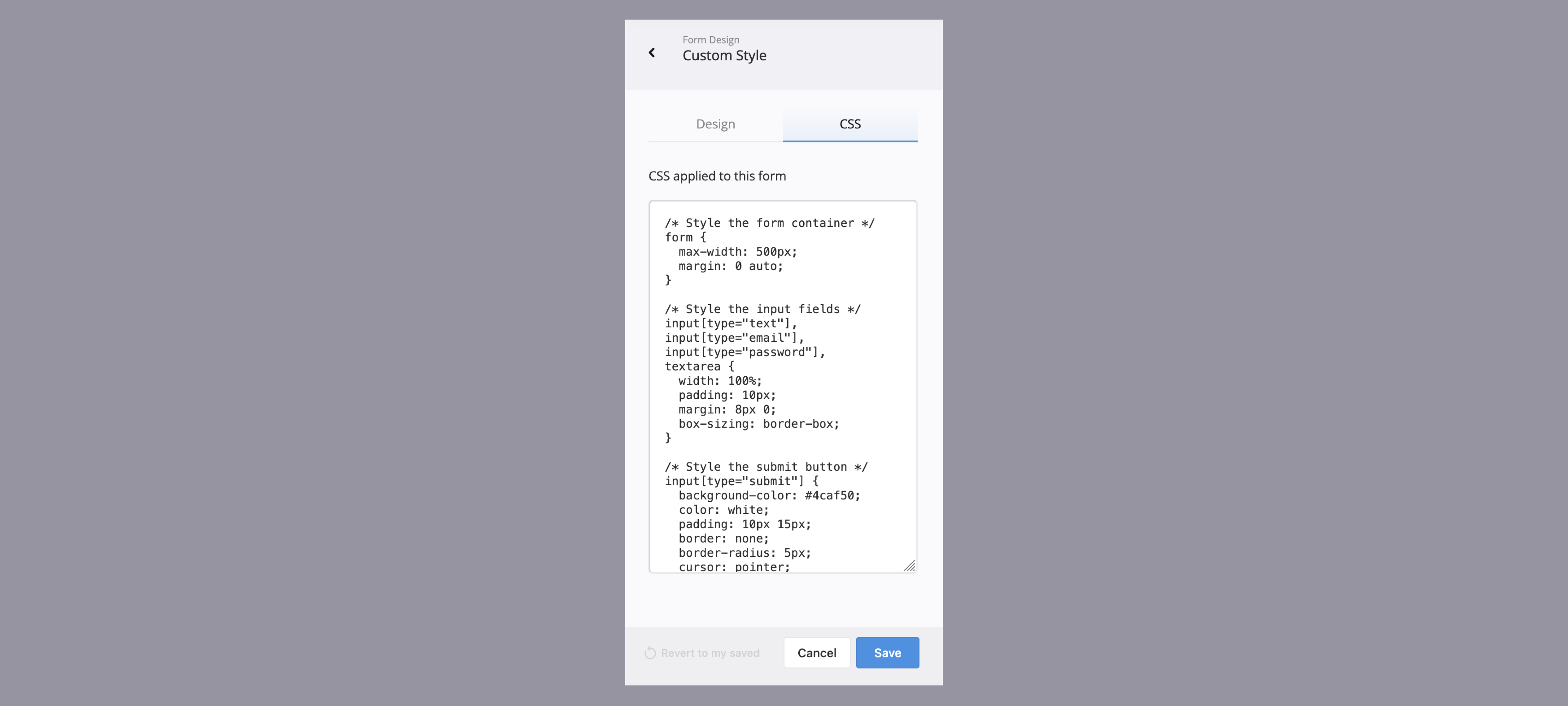 Under the CSS tab, add your custom CSS code to customize the appearance of your web PDF form.